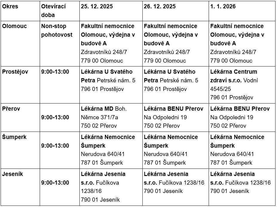 Aji v techto připadech zajistil Olomócké kraj v každym svym okresnim městě lékárenskó pohotovosť. Tato slôžba je zapotřebi přê státnich svátkách nekolêkrát do roka, ale nespolihéte na to, že připadně zamiřite, gde minôle. Poskêtovateli lékárenské pohotovsti se střidaji, tož si pro jistotô podle domovské přislušnosti nandite aji svojô apatykô. Ê gdêž, jak dófámê, jô nebôdete potřebovat.