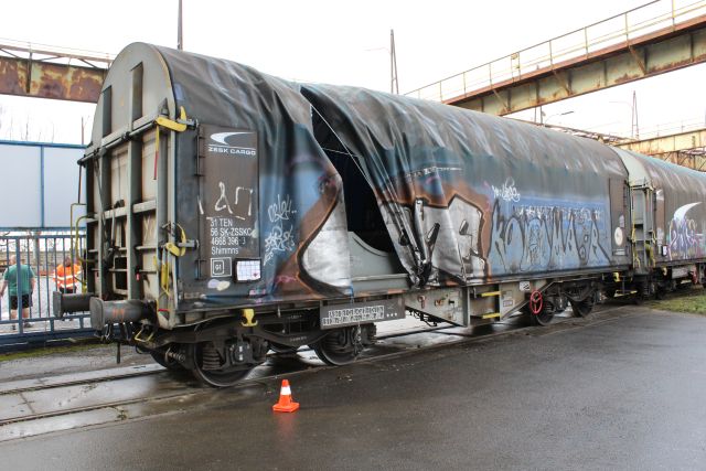 Co se přêhodilo? Šofér přê cófáni najel na zmiňované přejezd, gde, jak z ôděláni, zrovna jel posônôjici dil – mašina ze třema vagónama, strojvedócim a vedócim posônô. Návěsem šofér do jednyho vágónô drcl a bêlo vêmalovany.